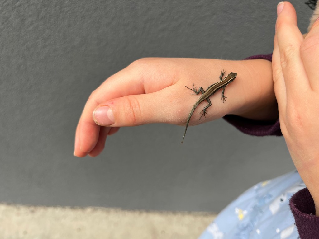 Spacer był krótszy niż planowaliśmy, bo zaczął kropić deszcz, ale zdążyliśmy jeszcze wracając pierwszy raz złapać jaszczurkę i poobserwować na dłoni. Nie wiedzieliśmy, że potrafią tak skakać, a raczej zeskakiwać. Starszak widział nawet któregoś razu nad lewadą, że potrafią pływać. Więc całkiem zdolne, te jaszczurki.