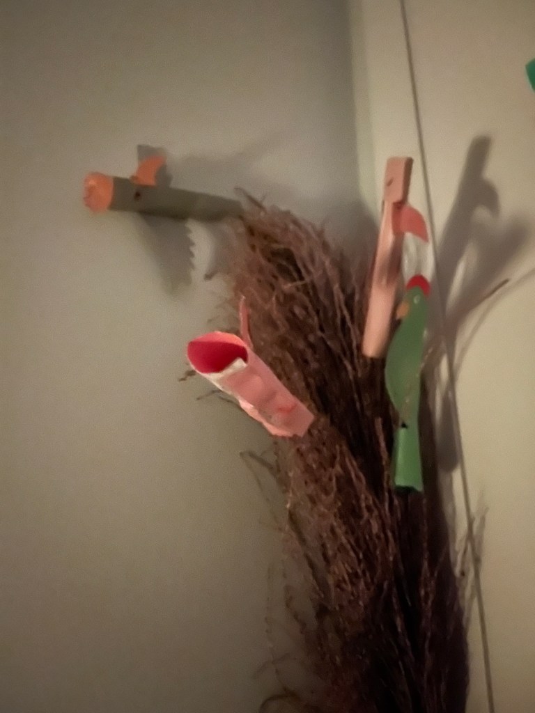 Młodsza dorwała teczkę z pomocami do prac plastyczno- technicznych. Zrobiła cały zestaw ptasich pacynek, poznając jednocześnie kilka gatunków. Oraz zagospodarowała półki w salonie na trzy sale zabaw dla swoich pluszaków.
