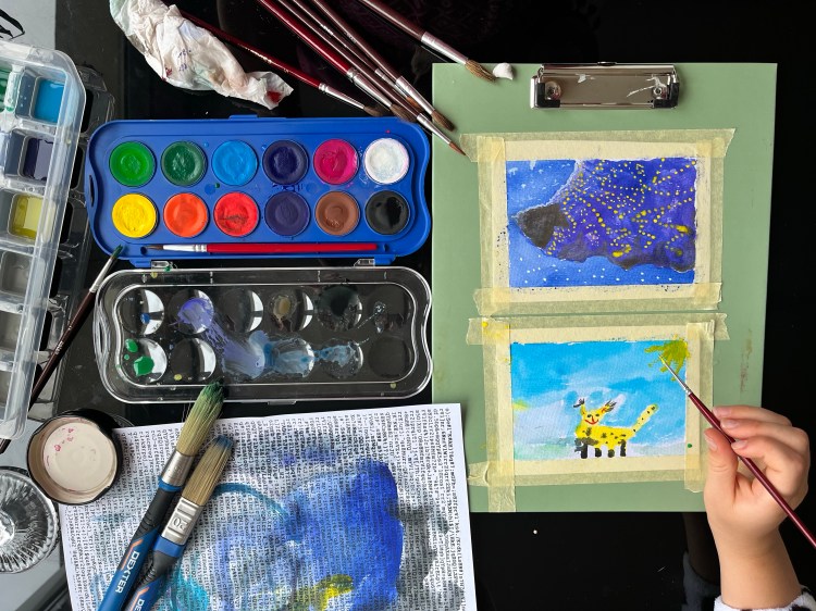 Chwile na działania plastyczne też znajdowaliśmy. Wypróbowałyśmy akwarele. I ja, i córka bardzo to lubimy. Niewiele trzeba by zacząć. Farbki i pędzle dla dzieci i grubszy papier, i działamy.