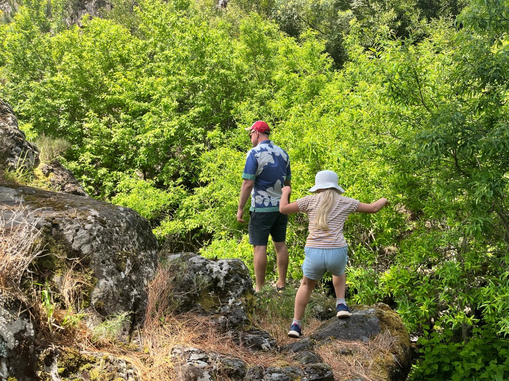 A jako ostatni punkt wybraliśmy Parque Ecologico do Funchal. Jest tam bar ze smacznym jedzeniem. Ładne widoki. I trochę dzikości w pobliżu rzeczki. Od kilku tygodni było sucho, więc córka z tatą przez skały powędrowała aż do samego strumyka. Mała, to mała, ale przygoda.
