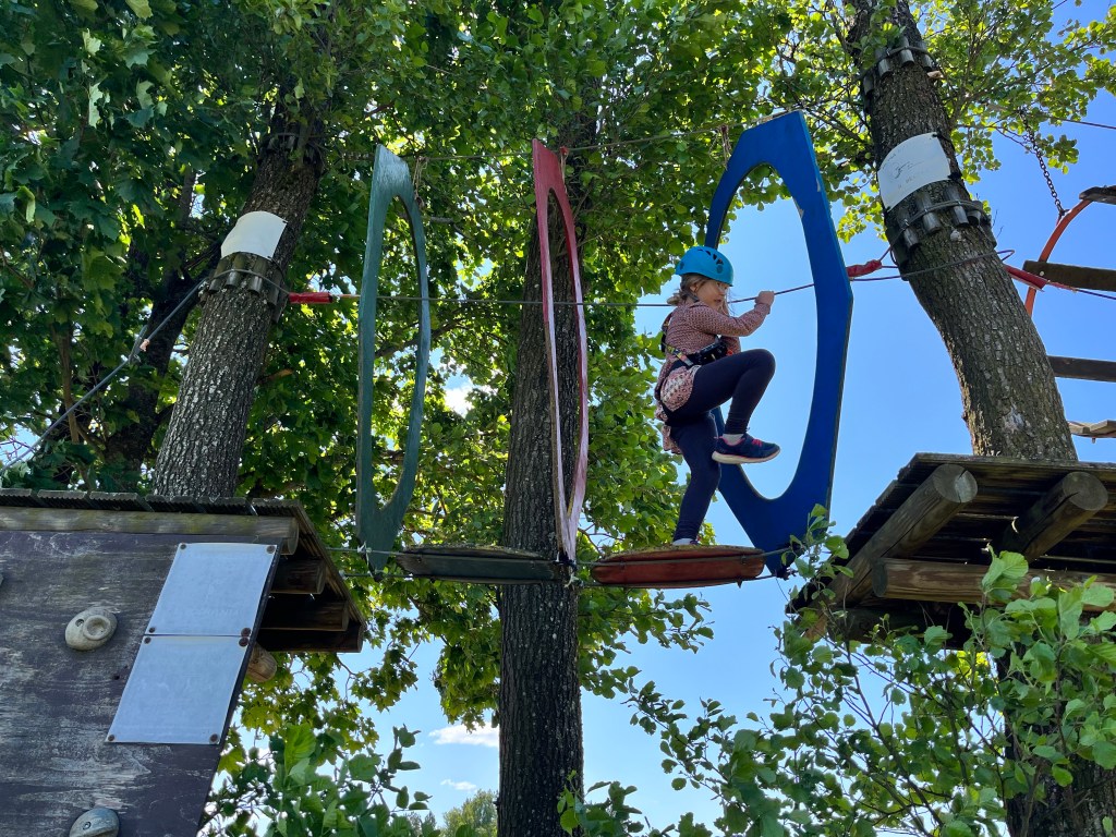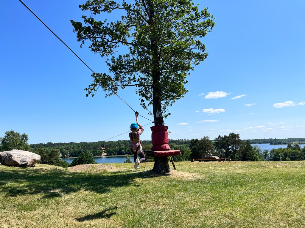 Tuż obok krowiego pastwiska był park linowy. Moja pierwsza myśl, że za wiele nie poszalejemy, ale okazało się, że widoczna część to trasa dziecięca, a dwie trudniejsze są w drzewach nad jeziorem. Trzeba było do nich zjechać po linie.