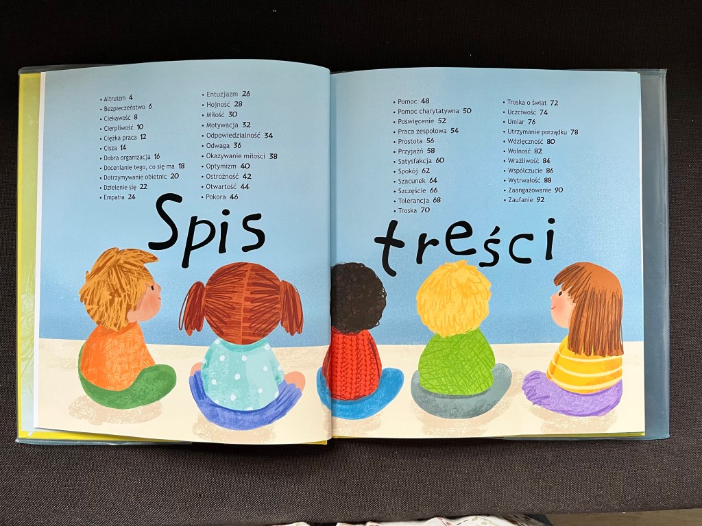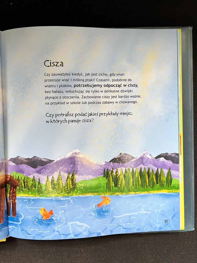 Ta książeczka zagościła u nas po wizycie w pobliskiej bibliotece miejskiej. Na początku byłam nieufna, ale po bliższym zapoznaniu, uważam, że w prosty sposób wyjaśnia różne istotne pojęcia. Zdecydowanie pozwala też poszerzyć zasób słownictwa. Do tego przyjemne, spokojne ilustracje. I pytanie na końcu każdego rozdziału odwołujące się do doświadczeń czytelnika.