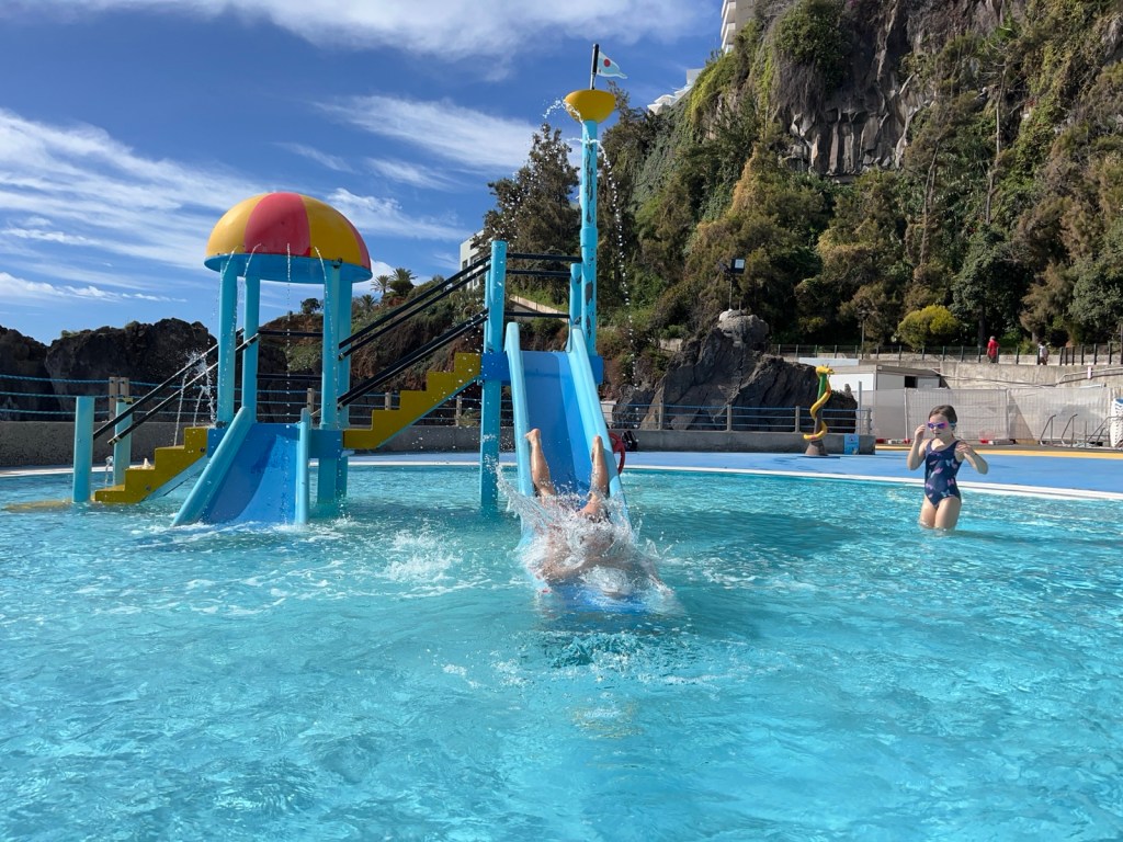 Tydzień zakończyliśmy jeszcze pierwszym spacerem pod maderskim lotniskiem. Jakie to ciekawe i fajnie zagospodarowane miejsce. Pozytywnie nas zaskoczyło. Ogromny parking, boiska do różnych sportów, możliwość organizacji urodzin dzieciakom z dmuchańcami, tor gokartowy, nawet ścianka wspinaczkowa dość wysoka. Do tego restauracja, bar i betonowa plaża niestrzeżona, okupowana przez wędkarzy. I dość długi, płaski odcinek do biegania, który bardo ucieszył męża. Płaskie trasy biegowe na Maderze są bardzo deficytowe.