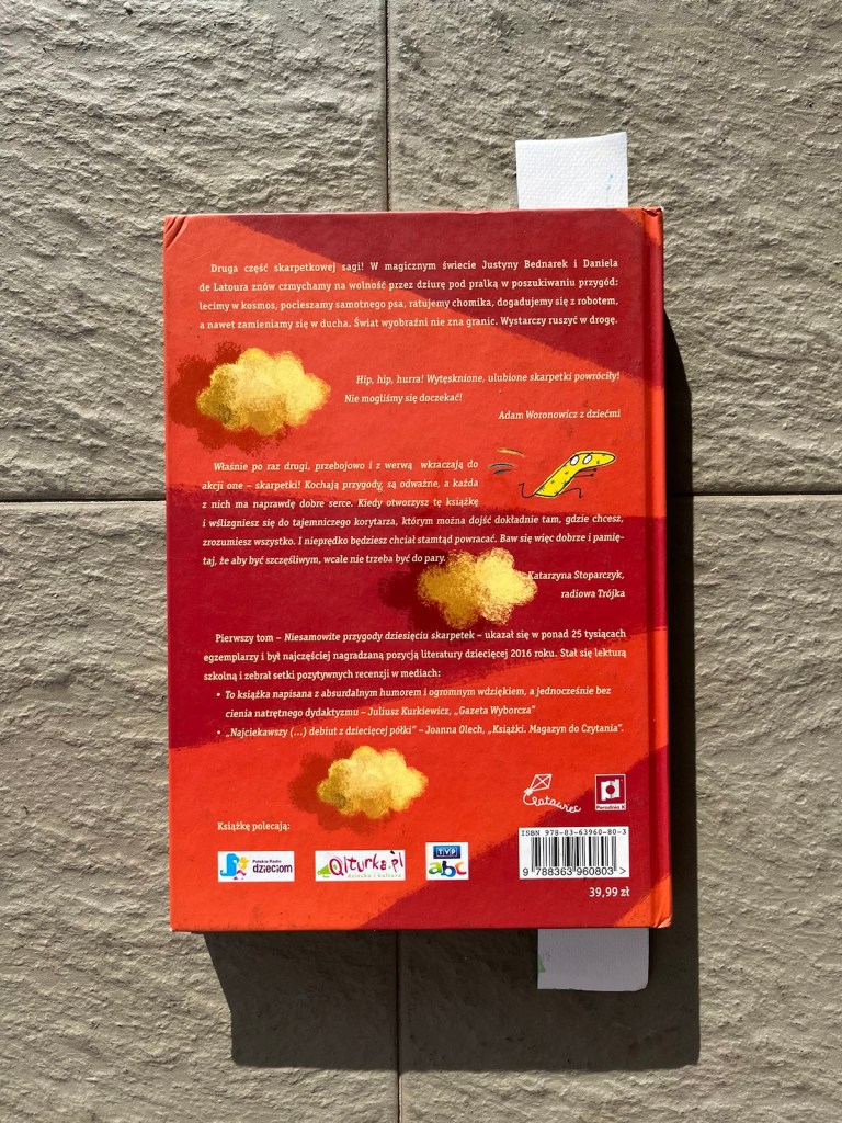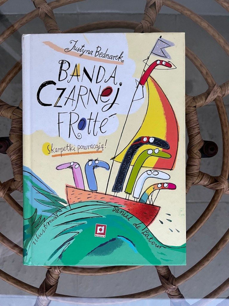 Wcześniej czytaliśmy pierwszą część Przygód Skarpetek. Ta jest chyba częścią czwartą. Wydana jest podobnie, jak pierwsza. Ilustracje i tekst mocno się wzajemnie dopełniają. Zabawne są już same podtytuły rozdziałów, którymi autorka żartuje z czytelnikiem. Przygody bandy Czarnej Frotté tak bardzo wciągnęły w swój świat, że czytane były po kilka rozdziałów dziennie, aż skończyliśmy dzisiaj. Dobrze, że na półkach czeka kolejna część.