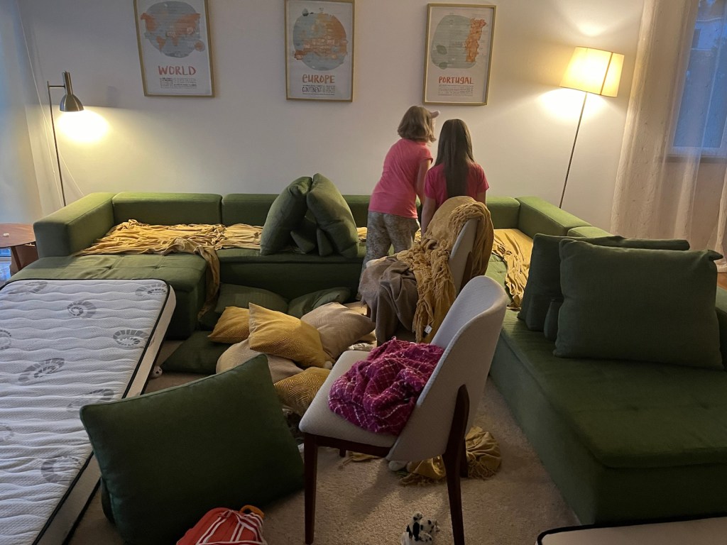 Zaliczyliśmy pierwsze nocowanie maderskiej przyjaciółki u córki. Obowiązkowym elementem były bazy i okupacja salonu, który przez ponad dobę pełnił wiele funkcji, m. in. zoo, domu, sceny do kalamburów, fortu, sali gier …