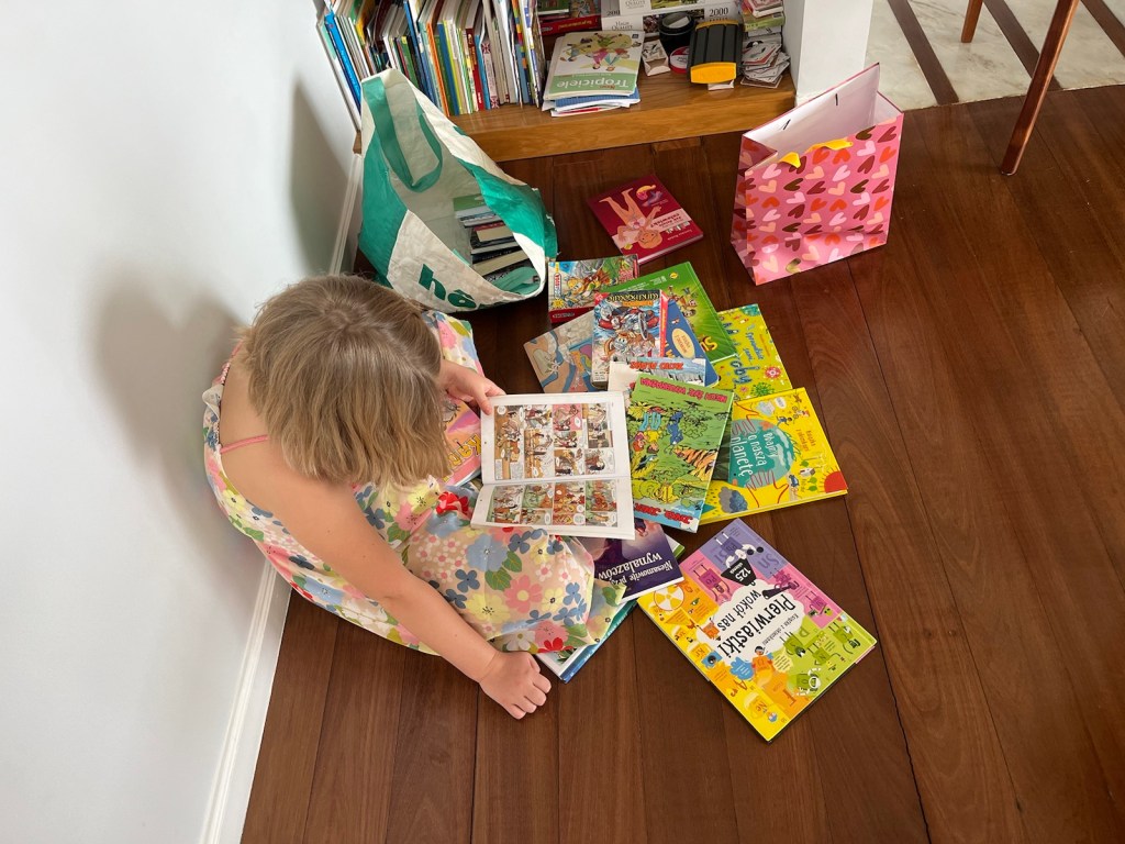 Przy okazji odwiedzin dawno nie widzianych koleżanek, wróciły do nas książki pożyczone im przed naszym poprzednim wakacyjnym wyjazdem do Polski. Zostały przyjęte przez dzieci jednocześnie, jak nowe i jak dobre przyjaciółki. Całe popołudnie spędzone już w ich towarzystwie.