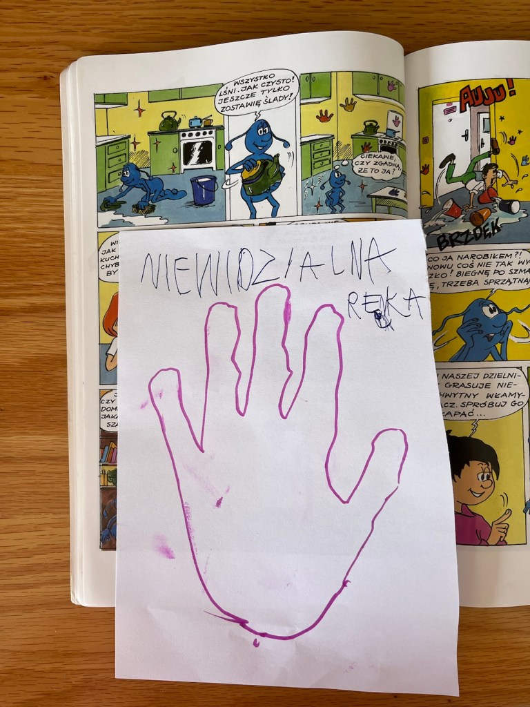 Za wszystkimi czytanymi przez dzieci komiksami nie nadążam. Czasem po kilka dziennie przerzucają. Ale z Niech żyje wyobraźnia Szarloty Pawel miałam wymierne korzyści. Przy niewielkiej podpowiedzi z mojej strony, pomysł komiksowy został zastosowany w rzeczywistości. A mama miała chwilę odpoczynku, dzięki działalności „niewidzialnej ręki”, a raczej rąk, moich ulubionych potomków.